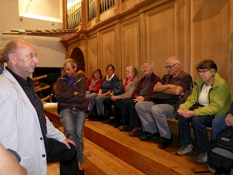 Ein architektonisch besonders eindrückliches, nordisch anmutendes modernes Gotteshaus - viel Holz, dachbodenartige Giebelkonstruktion, faszinierendes Lichtspiel durch die vielen Fenster - ist die Aussenstadtkirche St. Paul. Die Orgel ist vom schwedischen Karl Nelson 2012 erbaut worden und fügt sich sehr schön in den Raum. Mit den 24 Registern, verteilt auf Hauptwerk, Nebenwerk und Pedal mischte Bernhard Gfrerer, Organist an der Franziskanerkirche, die sonnige, morgendlich heitere Stimmung des Raums musikalisch aufs munterste auf. In der altehrwürdigen Franziskanerkirche stehen zwei Metzler-Instrumente. Die ältere, klanglich ausgewogene Chororgel war leider wegen Reinigungsarbeiten nicht zu hören. Auf der Hauptorgel spielte uns der Meister Musik von Mozart, Lemmens, Guilmant u.a., wobei er sowohl die poetischen Seiten des Instruments wie auch ein durch alle Knochen fahrendes Klanginferno demonstrierte.